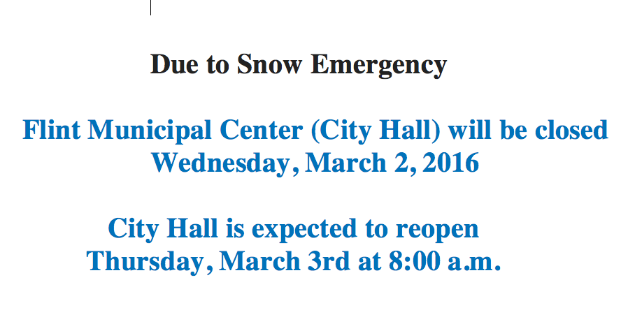 March 1, 2016– Please be advised that due to the Winter Snow Emergency now in effect for Genesee County, the Flint Municipal Center (City Hall) will be closed starting today, March 1, 2016 at 3:00 p.m. and will remain closed Wednesday, March 2, 2016.
