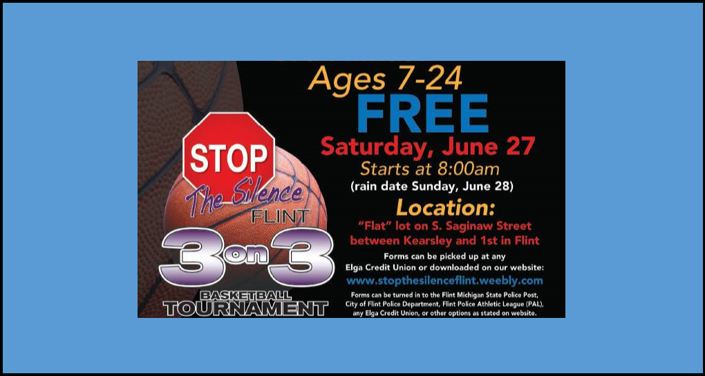 For those between the ages of 7 and 24 who are interested basketball, there will be a free 3 on 3 Basketball Tournament coming in 2 weeks to Downtown Flint. The 3rd Annual Stop the Silence 3 on 3 Basketball Tournament will be held on Saturday, June 27 at 8am at the DDA flat lot. Registration is open to ages 7-24 and the registration form is attached to this post. You can register as a team or as an individual and you will be placed on a team.