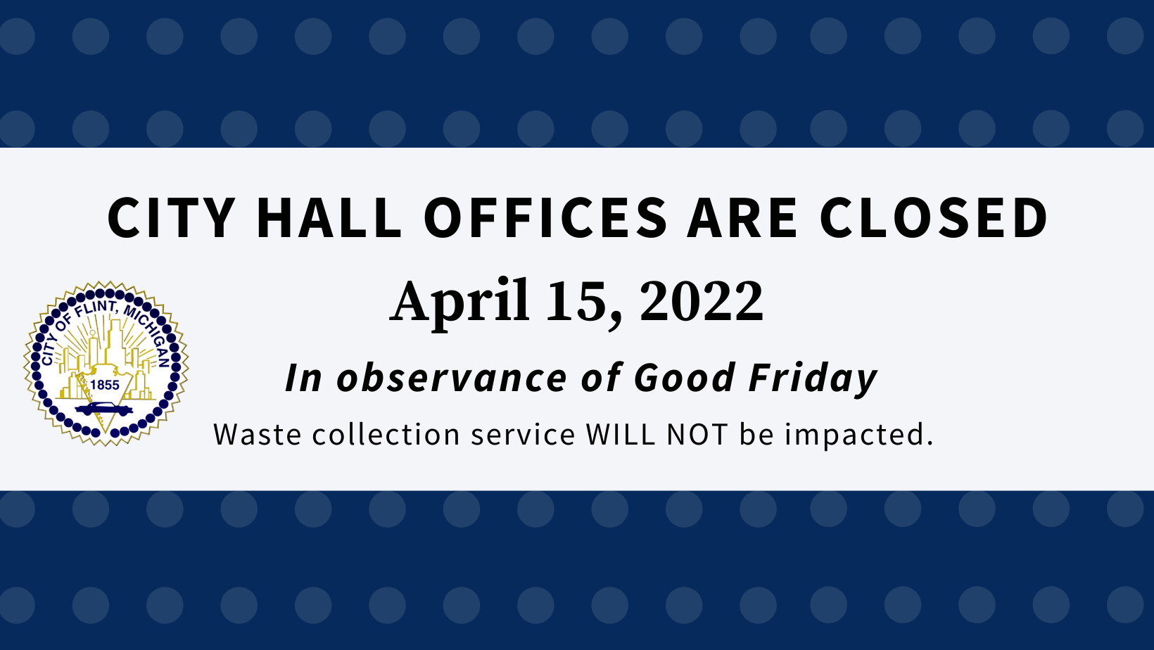 FLINT, Michigan — Please be advised that City Hall offices are closed in observance of Good Friday, April 15, 2022.