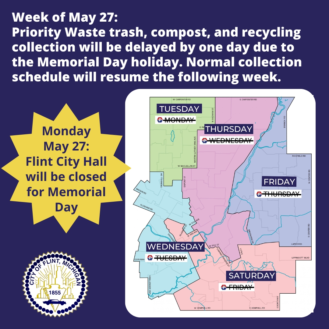 Flint City Hall will be closed Monday, May 27 for Memorial Day holiday; waste collection services delayed by one day