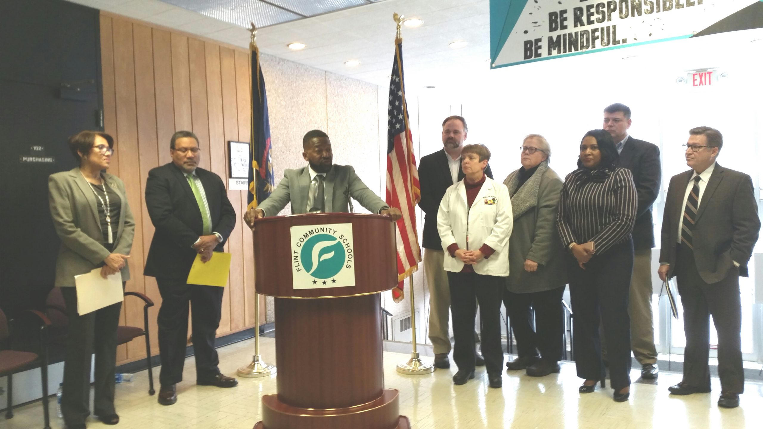 Flint, Mich– Mayor Karen Weaver stood with Flint Schools Superintendent Bilal Tawwab, local pediatrician Dr. Lawrence Reynolds, and other community leaders Wednesday, to provide an update on the water crisis recovery effort underway in the City of Flint.