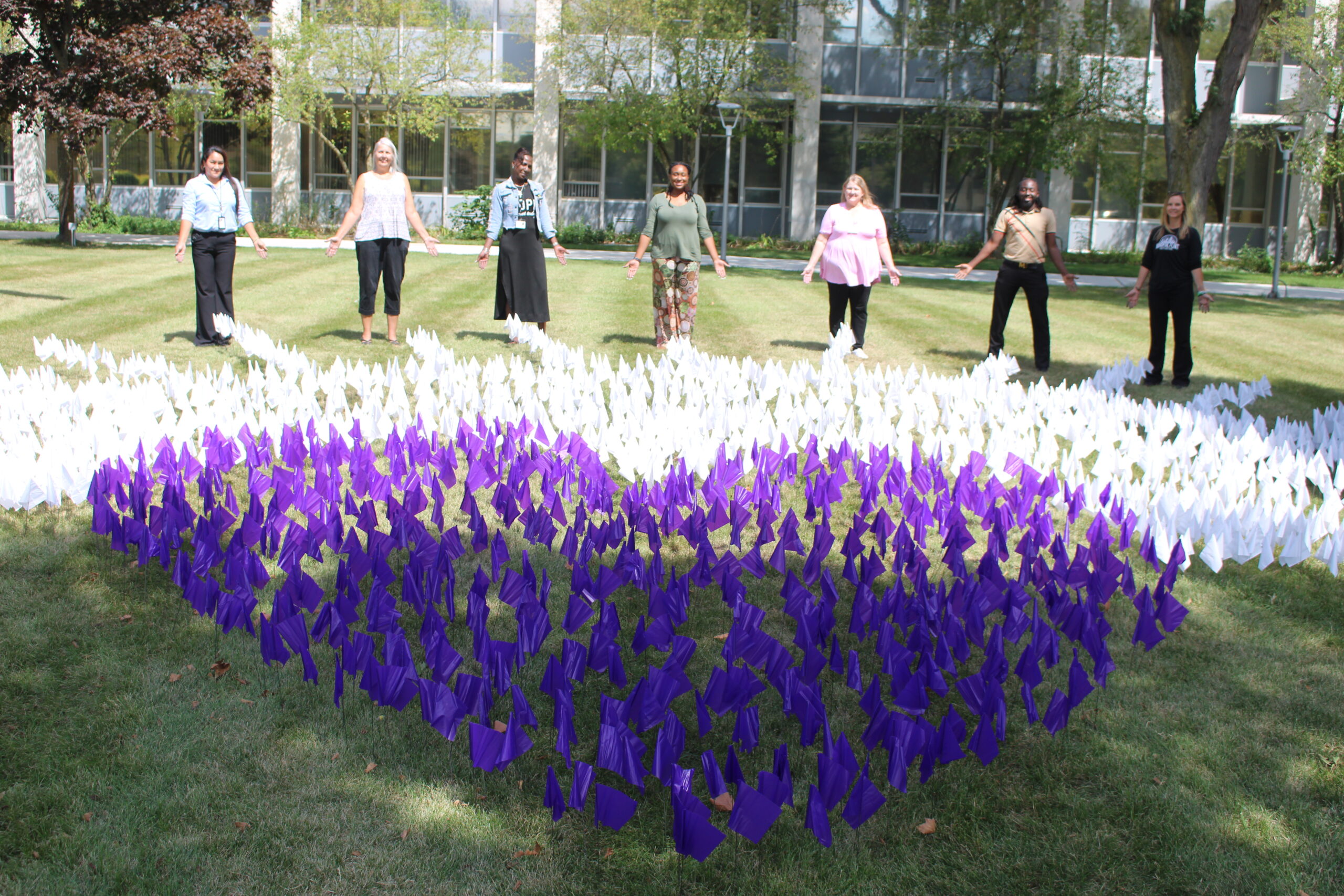 In tribute, a visual installation featuring purple flags (representing lives lost) and white flags (honoring lives saved) has been placed on the lawn to promote awareness and remembrance.