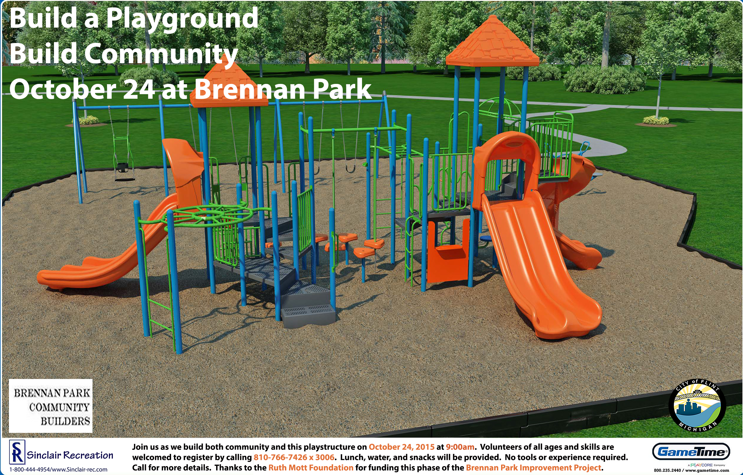 The City of Flint and Brennan Park Community Builders seek at least 50 volunteers to assist with the installation of a new playground at Brennan Park. The Playground improvements are made possible by a generous grant from the Ruth Mott Foundation to the City of Flint and Brennan Park Community Builders.